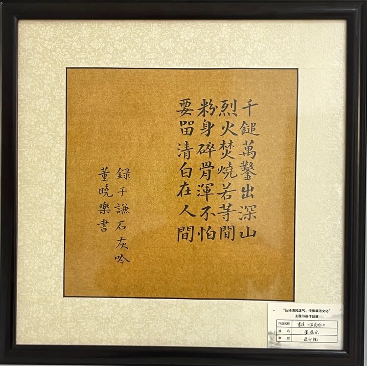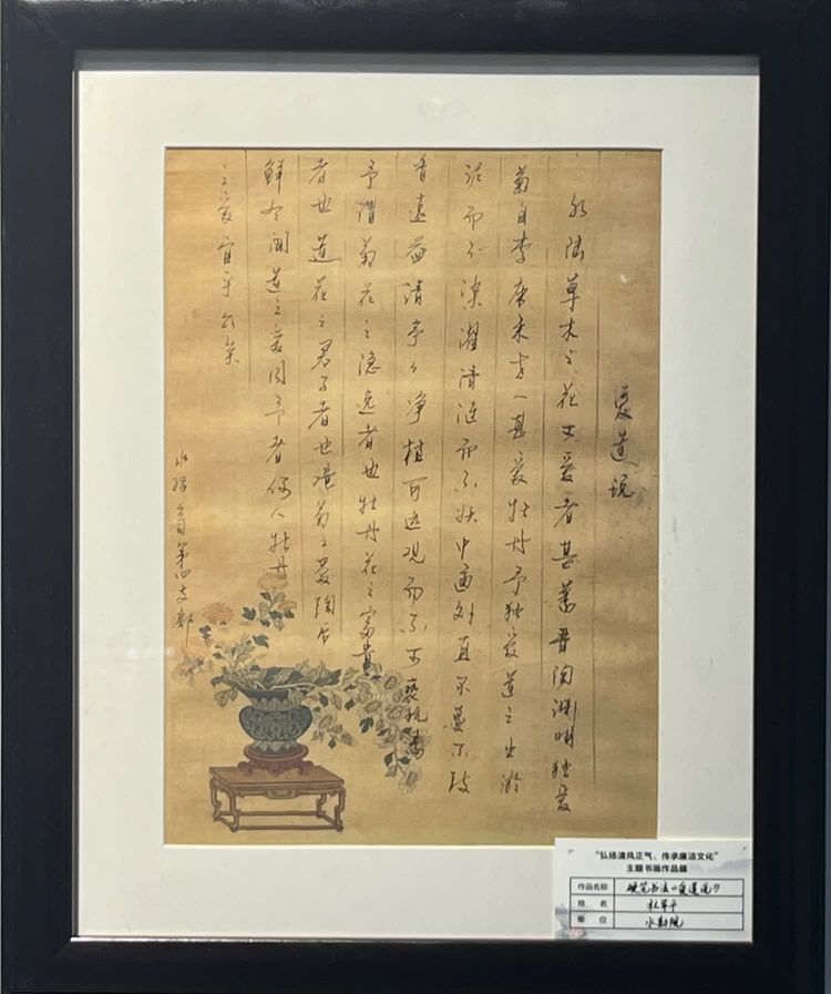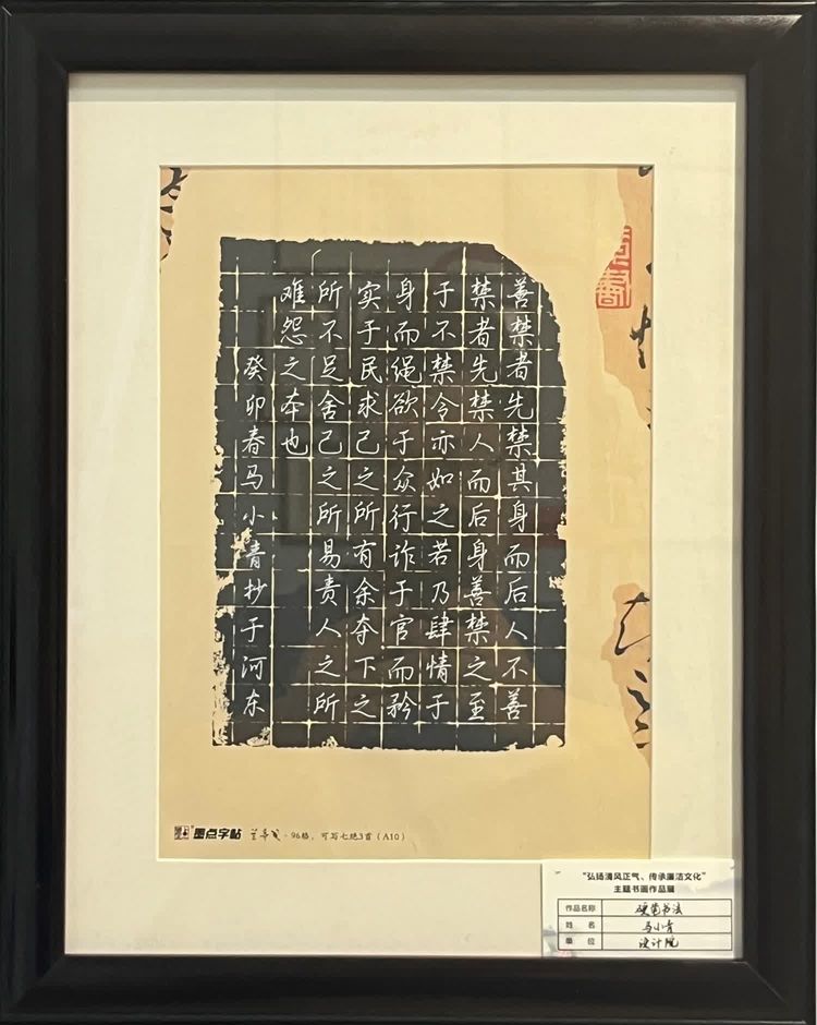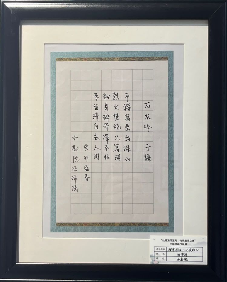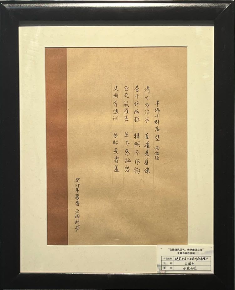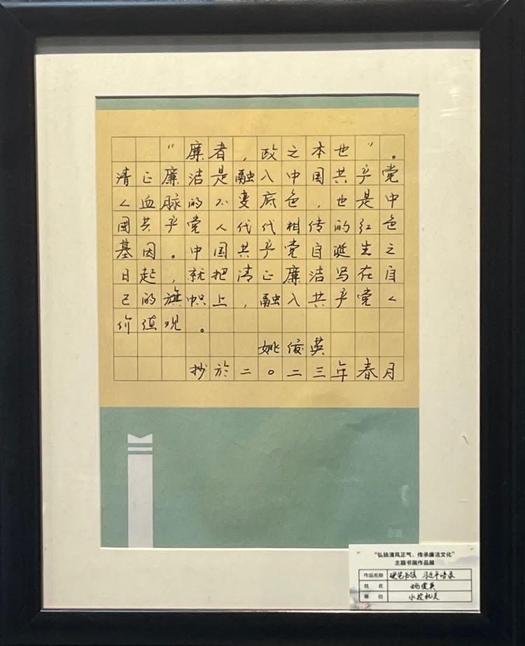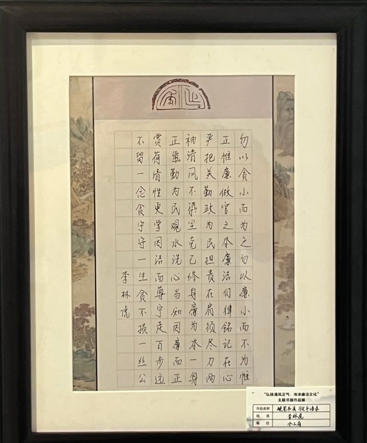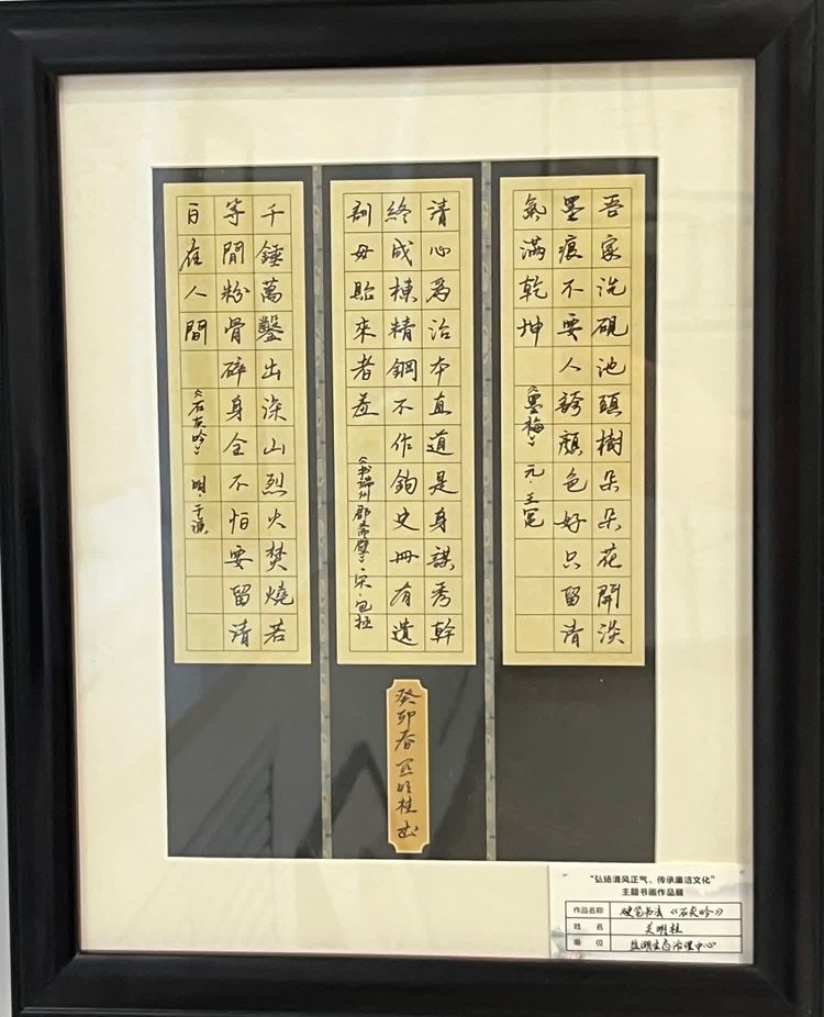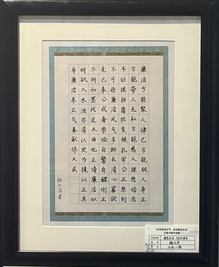 “清廉者,乃清正廉潔、大道直行、奉公守法也”“粉身碎骨渾不怕,要留清白在人間”“不要人夸好顏色,只留清氣滿乾坤”《清廉賦》、《石灰吟》、《墨梅》……一張張寫滿正氣的書法、一幅幅描繪廉潔的畫卷,傳遞著清正廉潔主旋律,弘揚(yáng)著擔(dān)當(dāng)實(shí)干正能量。