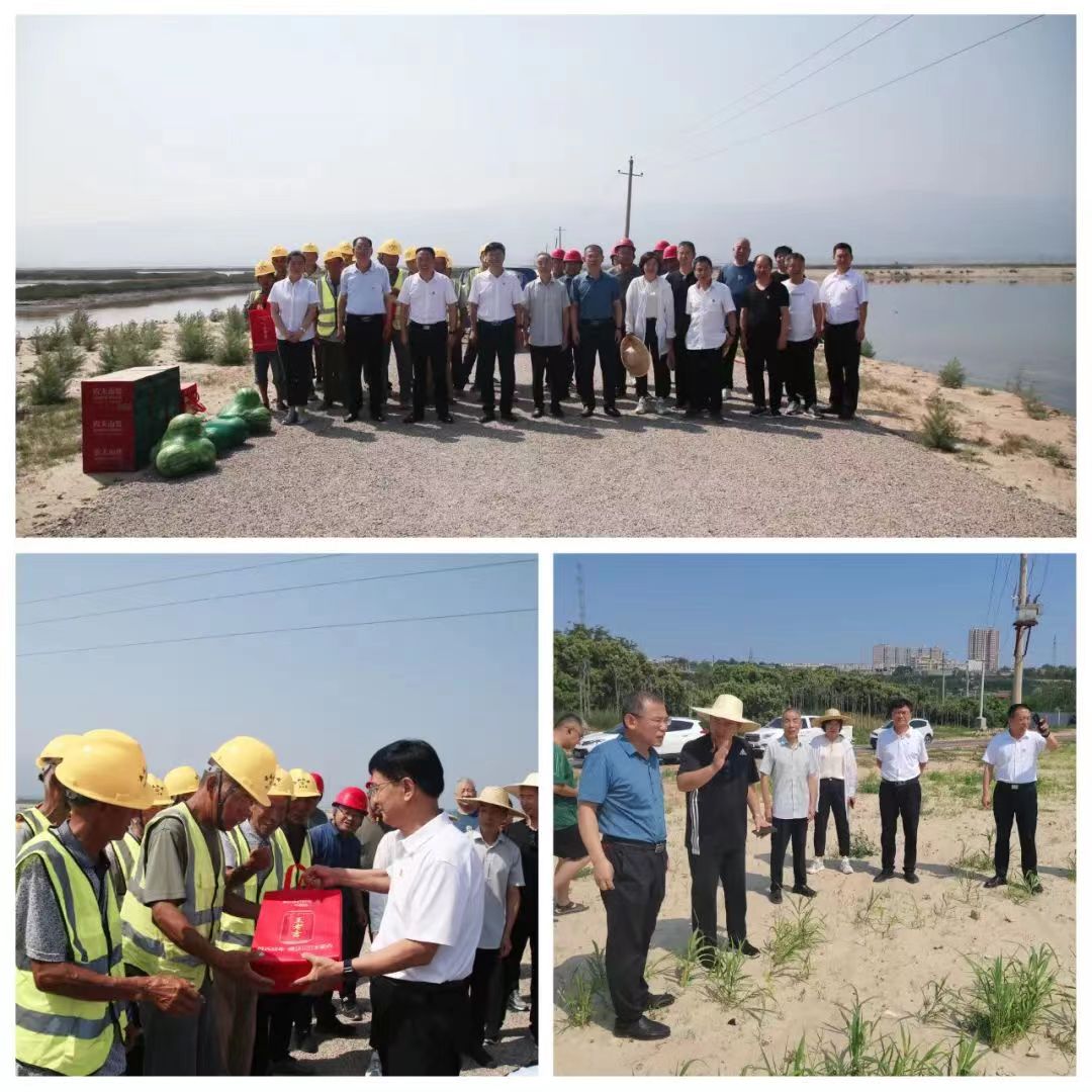 隨后,公司領(lǐng)導(dǎo)一行人來到鹽湖項目11號堤埝施工現(xiàn)場,慰問在高溫酷暑下堅持奮戰(zhàn)在一線的工人,并為他們送去防暑降溫慰問品。同時,深入鹽湖堤埝二號灘和19號路,詳細了解灘面護坡綠化情況,坡面綠草茵茵,不同種類植物長勢喜人;現(xiàn)場查看了傾斜電桿更換和扶正處理后情況,一定程度上消除了安全隱患,確保周邊居民和鹽池防汛調(diào)水用電安全,同時也起到了美化環(huán)境效果。