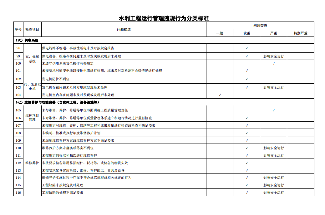 第十一條 對(duì)檢查發(fā)現(xiàn)的運(yùn)行管理問(wèn)題按照運(yùn)行管理違規(guī)行為分類(lèi)標(biāo)準(zhǔn)和工程缺陷分類(lèi)標(biāo)準(zhǔn)進(jìn)行認(rèn)定。