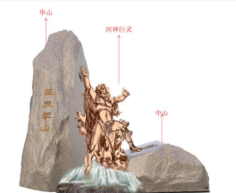 巨靈擘山,誕生中華,隱喻黃河母親,哺育華夏人族,開(kāi)啟中華人類(lèi)史。人類(lèi)除了道法自然,還可以掌握規(guī)律,改造自然,從而為參贊化育,造福人類(lèi)。也說(shuō)明中華民族,本來(lái)一體,不可分割。