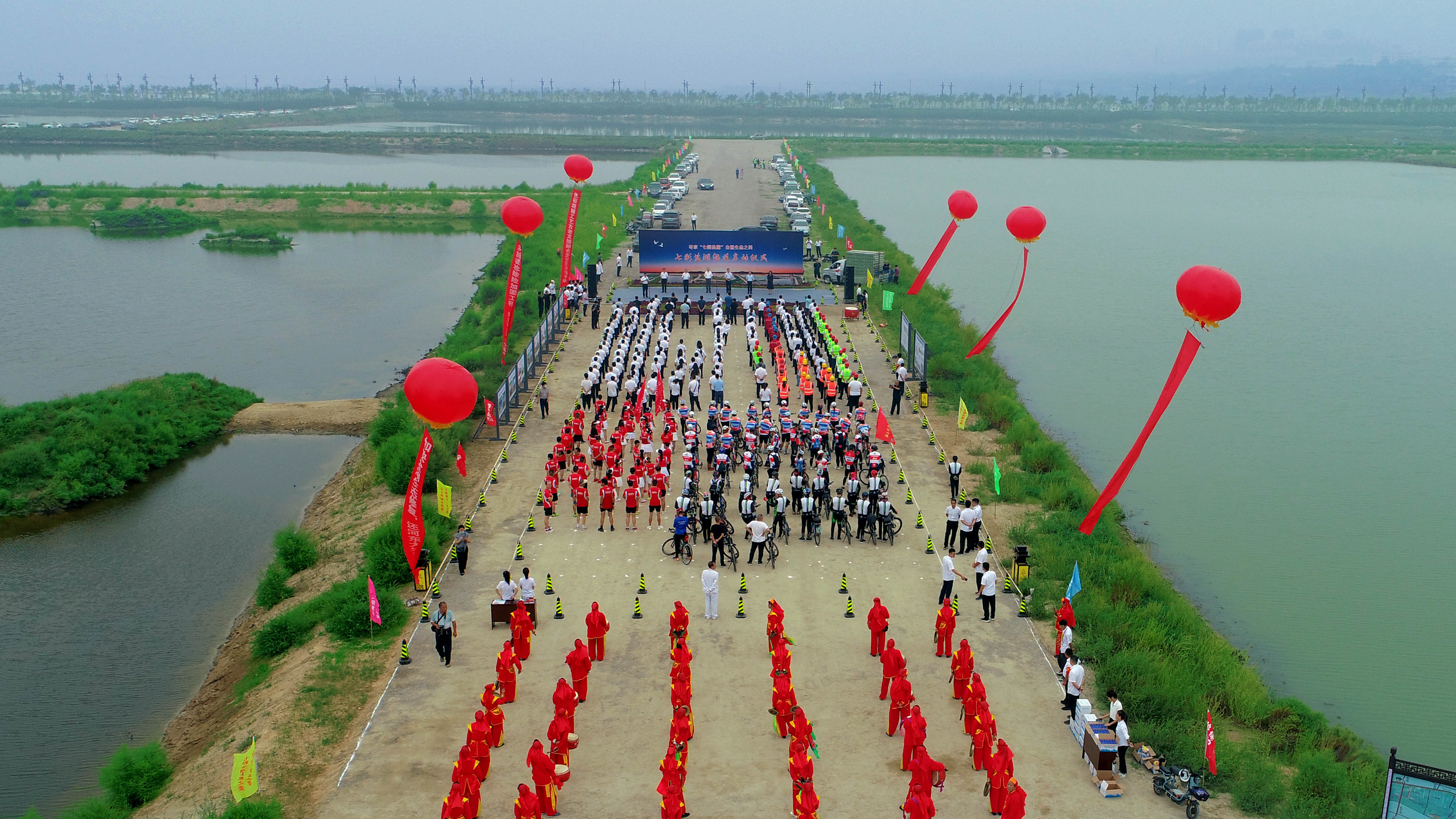 啟動儀式由鹽湖生態(tài)保護與開發(fā)中心主任孫冬青主持,市人大、市政協(xié)、市紀委監(jiān)委、市委宣傳部、市委組織部、鹽湖區(qū)委、區(qū)政府等23家市、區(qū)相關單位和各參建單位參加了啟動儀式。市水投公司董事長崔作銘介紹了鹽湖堤埝除險加固及生態(tài)修復(一期)項目建設概況,市委常委、副市長董旭光宣布七彩鹽湖綠道啟動。百 人齊聚,千鴿展翅競飛,共同見證了這一激動人心的歷史時刻。同時在這里開展了百人酷跑和騎行團隊綠色環(huán)湖行。