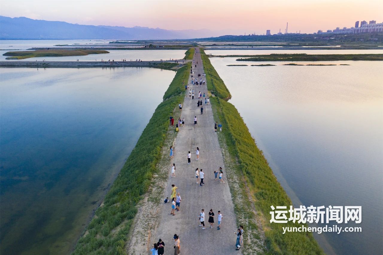 清晨6點,中條山下涼風(fēng)習(xí)習(xí),靜謐清麗。但圍繞鹽湖岸畔的步道上,穿著清涼晨跑的,扯著嗓子練聲的,舉著相機拍照的,人來人往,生命涌動的力量激蕩著黎明的寧靜。待清晨的第一縷陽光瀉向湖面,自帶柔光濾鏡,碧波浩渺,遠(yuǎn)山蒼茫,美得不可方物。
